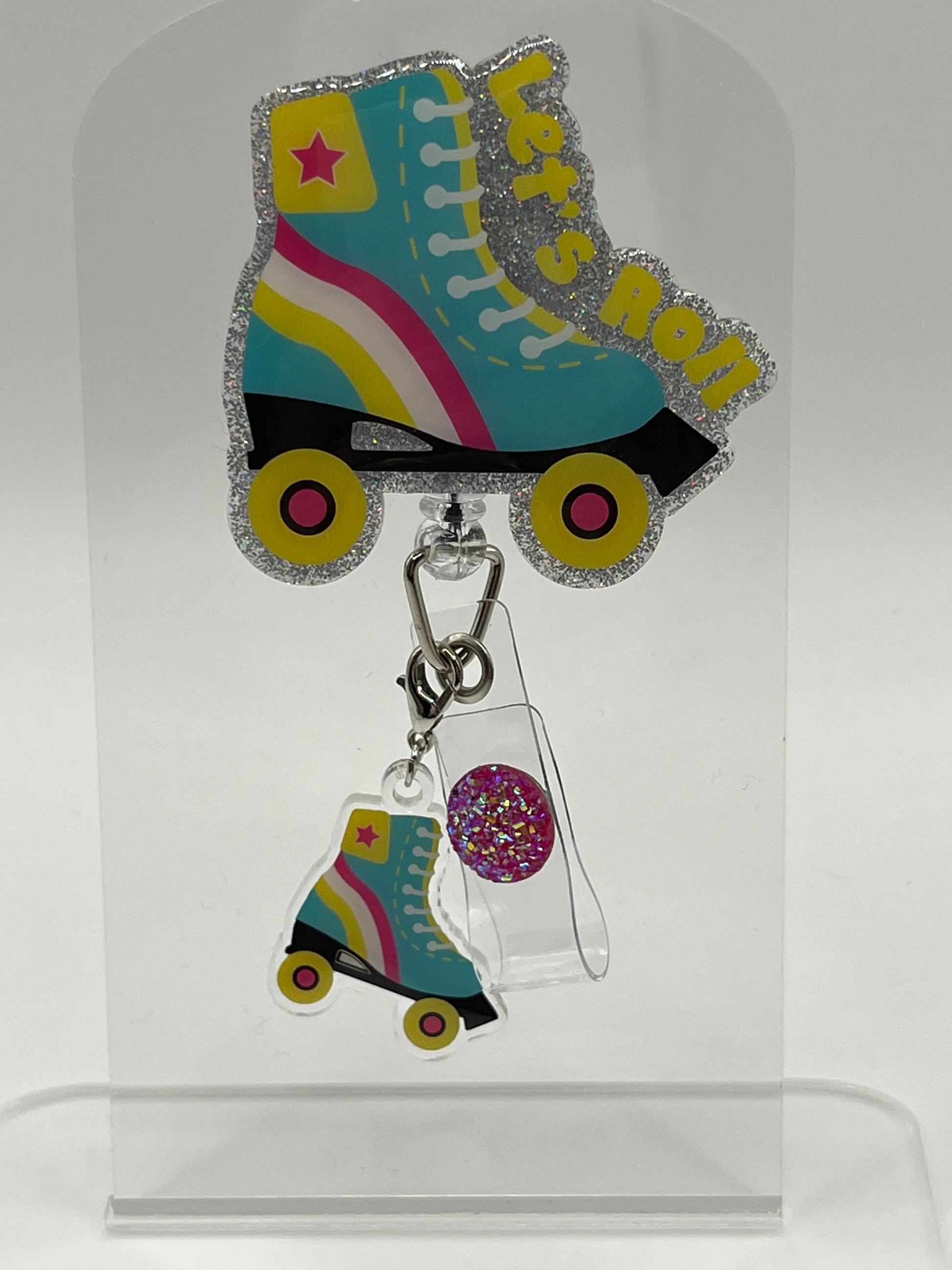 2 inch badge reel that comes with a alligator clasp. This badge comes with matching charm.